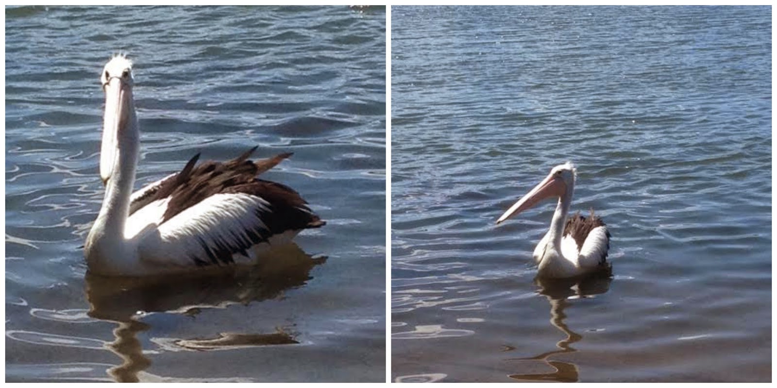 A lone pelican watched as P:-) checked out the outboard motor on the boat ramp.